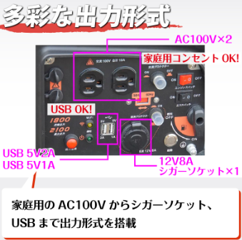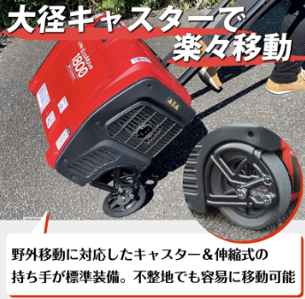 ※送料無料(沖縄・離島は要お問い合わせ)となります 【ハイコストパフォーマンスを届けるプロ整備士の味方、ProTOOLs】 [商品の情報] 1.本インバーター発電機は、長年の技術と最新技術の融合により、軽量化を実現。最大出力2.1kVAでありながら、仕事や生活に十分な発電量1800Wを達成、12Vシガーソケット付きで、車載冷蔵庫や電化製品など様々な場面に対応可能。 2.利便性が向上。重心を製品の中心を置く独自の構造で移動を快適に、オフロード仕様の嵩上げできるタイヤで持ち運びが便利。スーツケースの形で、女性でも軽く移動させることができます。 3.独自の設計で静かな運転が可能。吸気ダクトの防音ボックスや、サイレントマフラーで騒音を最小限に抑えながら冷却効果に優れています。 4.安全性重視。横置き可能な独自のキャブレターとガソリンタンク設計により、ガソリン漏れを防止。他社と異なり、移動時にガソリンを抜く必要がありません。 5.操作パネルにスイッチが集約しているので、操作がシンプルでスムーズ。 6.Wi-Fi機能も搭載、専用アプリ「Gen-mate」をインストールしたスマートフォンと遠隔操作が可能、モニタリング機能付き。 メーカー品番:EM1800 JANコード:4580080483932 シリーズ:EcoMove タイプ:1.8kVAインバーター発電機 カラー:レッド 容量:燃料タンク容量:4.2L 質量:26kg 商品サイズ:全長(本体):530mm 全高(本体):430mm 全幅(本体):320mm セット商品/付属品: 発電機本体×1 バッテリー充電コード×1 セルスタートバッテリー用充電コード×1 ドライバー(プラス・マイナス兼用)1組 プラグレンチ・六角レンチ・ハンドル各1 ドライバー・レンチ用ポーチ×1 オイルファンネル×1 かんたん操作手順ガイド×1 取扱説明書×1 仕様: 【エンジン】 タイプ:4ストロークガソリン OHV 冷却システム:強制空冷 シリンダー配置:単気筒 排気量:80cc ボア×ストローク:48.6mm×43.0mm 燃料タイプ:無鉛ガソリン 燃料タンク容量:4.2L オイル種類:SAE 10W-30または10W-40 オイル容量:0.35L 点火プラグ:TORCH A5RTC / NGK CR6HSA ギャップ 0.6〜0.7mm 定格連続運転時間:エコスイッチOFF:3.5時間(定格負荷)/エコスイッチON:8時間(1/4負荷) 点火システム:CDI 駆動方式:リコイル/電動スターター 騒音レベル(LWA):CE規格で4mから 保証騒音値:92dBA 【交流出力】 出力波形:純正弦波、THD<3% 定格電圧:100V 定格周波数:50/60Hz 定格出力:1.8kVA 最大出力:2.1kVA(3 秒間) 安全装置タイプ:電子制御 【直流出力】 定格電圧:12V 定格電流:8A USB:5V/2A/1A 安全装置タイプ:DCプロテクター 注意: ・ご使用前に、必ず取扱説明書をご覧下さい。また、本機を貸与または譲渡される場合は、取扱説明書も合わせてお渡し下さい。 ・排気ガス中には一酸化炭素などの有害な成分が含まれており、一酸化炭素中毒になると死に至る可能性があり危険です。ご使用になる方はもちろん、周りの人や、動植物などにも十分ご注意下さい。換気の悪い場所では使用しないで下さい。 ・本機や本機に接続した電気機器を雨水などの水で濡れた状態で使用したり、また濡れた手で操作すると感電する恐れがあり危険です。雨の中や水のかかる場所での使用・保管はしないで下さい。 ・保証期間は購入日から1年間です。