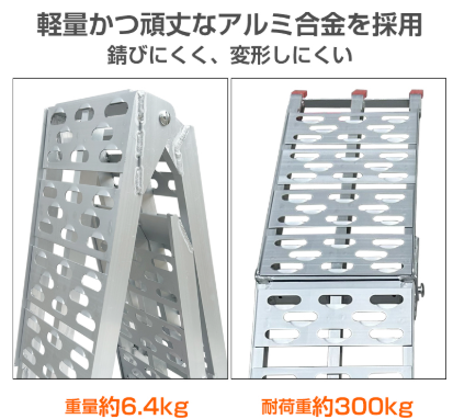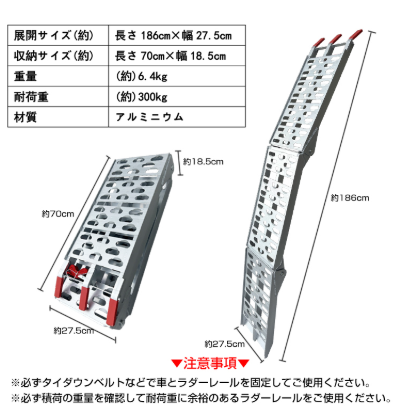 ※北海道、沖縄・離島のみ「宅配便120サイズ」に既定の送料がかかりますが、他は送料無料です ■バイクなどの積み込みにおすすめなラダーレール ■フックの形状は『ツメ式』 ■全長186cmのロングサイズ ■角度がなだらかになっている湾曲タイプ ■レールの穴の下は凸型の滑り止め加工 ■軽量かつ頑丈なアルミを採用 ■3つ折りで超コンパクト収納 ■タイダウンベルト付き 【商品内容】:ラダーレール/タイダウンベルト 【展開サイズ(約)】:長さ186cm×幅27.5cm 【収納サイズ(約)】:長さ70cm×幅18.5cm 【重量】:(約)6.4kg 【耐荷重】:(約)300kg 【材質】:アルミニウム ○使用上の注意事項○ ※タイダウンベルトなどで車とラダーレールを固定してご使用ください。 ※300kgを超えるバイクもございます。耐荷重にはご注意ください。 ※改造/本来の目的以外/強い衝撃などはお控え下さい。 ※仕様は入荷時期により予告なく変更する場合があります。 ※ディスプレイ画面等の環境上、写真と実際の商品の色とは多少違う場合がございます。 ※海外輸入商品により、汚れ/ダメージ等がついている場合がございます。 ○以上、ご同意の上ご購入ください!○