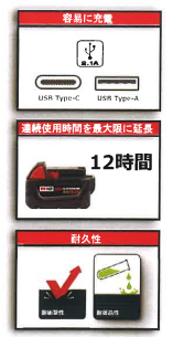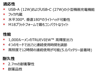 [機能] ●1,000ルーメンのTRUEVIEW™ 高輝度出力 ●USB-A (12W)およびUSB-C (27W)の小型機器充電機能 ●水平300°、垂直180°のライトヘッド可動性 ●4つのモードで出力と連続使用時間を調節 ●高照度で12時間の連続使用が可能(5.0AHバッテリー装着時) ●2.7mの耐衝撃性 ■製品詳細 https://www.milwaukeetool.co.jp/m18-service-area-light?M18+ALIS-0+APJ