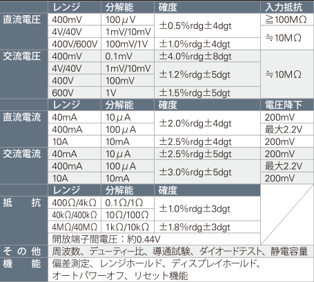 コストパフォーマンスに優れた多機能テスター 特長 ●シンプルな操作で使いやすい。 ●持ちやすく、測定しやすいハンディサイズ。 ●別売クランプアダプターを使用することで大電流の測定が可能。 ●ディスプレイホールド、レンジホールド。 ●テストリード固定機能付きホルスターが付属。 ●卓上での使用に便利な傾斜スタンド付き。 ●スペアヒューズ、スペア電池付き。 仕様 表示:4000カウント、文字高12mm サンプリング:2回/秒 レンジ切換:オートレンジ 電源:1.5V R6P(単3)電池 2個 寸法・重量:155(H)×75(W)×29(D)mm、180g 付属品: ホルスター 100-50テストリード 1.5V R6P(単3)電池(本体内蔵およびスペア)各2本 F14スペアヒューズ(0.5A/250V)1本 F17スペアヒューズ(10A/250V)1本 別売付属品: 660 AC/DCクランプアダプター 100-41テストリードキット 100-62テストリードセット 731BNC変換アダプター 793コイル型コンタクトピン 940ワニグチクリップ 995キャリングケース