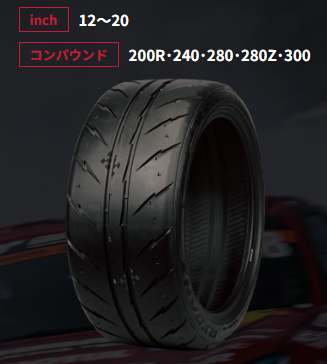 ※送料は1本あたり1,100円(沖縄県は1,650円)となります。このカートのシステム上では対応できない場合がありますので、自動配信メールの次に届く「ご注文受付メール」にて、最終的に訂正したものをお送りします。それまではお振り込みなさらないようお願いします(銀行振込の場合) 【R23】 元祖シバタイヤユーザーと一緒につくり上げた俺たちのタイヤ [コンパウンド解説] 280Z 280ならではのマルチパフォーマンスはそのままに軽自動車・コンパクトカー向けに開発したコンパウンドです。耐摩耗性に配慮しながら高次元のグリップとコントロール性能を追求しています。 300 手の届きやすい価格とロングライフ性能を両立したストリート向けのコンパウンドです。扱いやすさと優れたグリップが見事に調和。ドリフト走行で使うと剥離する場合があるため、ドリフト走行では240をお使いください。